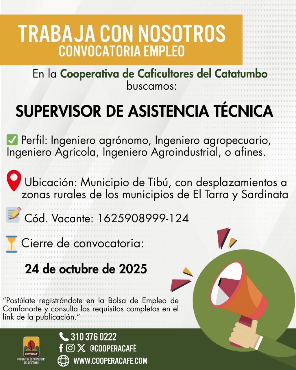 En la Cooperativa de Caficultores del Catatumbo (Cooperacafé) estamos en busca de nuevos talentos y tu podrías ser uno de ellos.