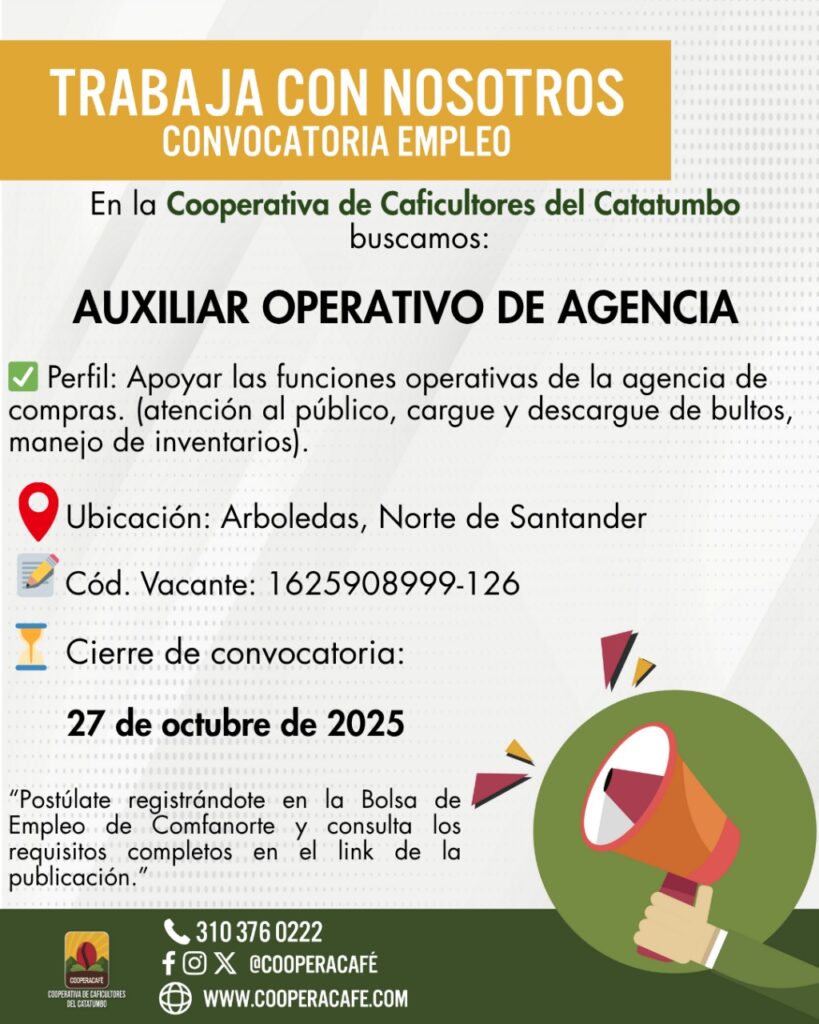 ¡Estamos buscando talento para nuestro equipo!En la Cooperativa de Caficultores del Catatumbo abrimos convocatoria para el cargo de Auxiliar Operativo de Agencia.