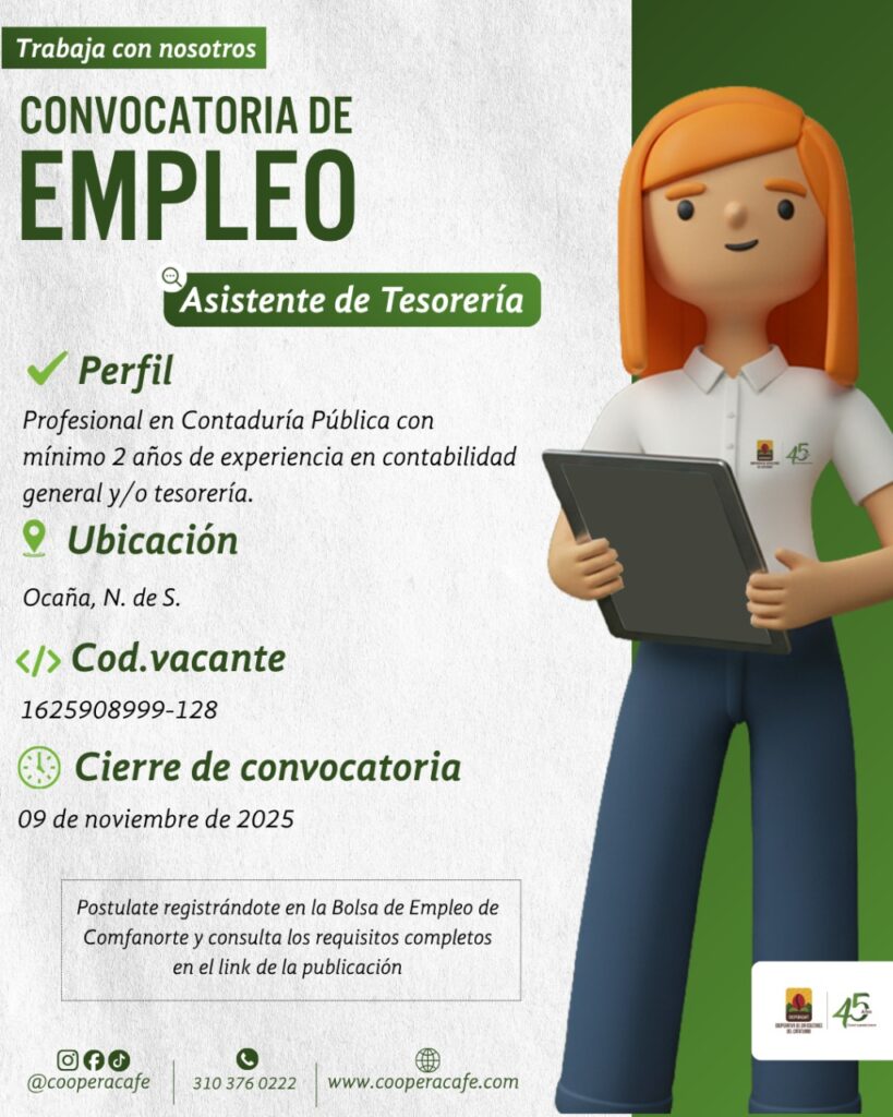 ¡Estamos buscando talento para nuestro equipo!En la Cooperativa de Caficultores del Catatumbo abrimos convocatoria para el cargo de Asistente de Tesorería.
