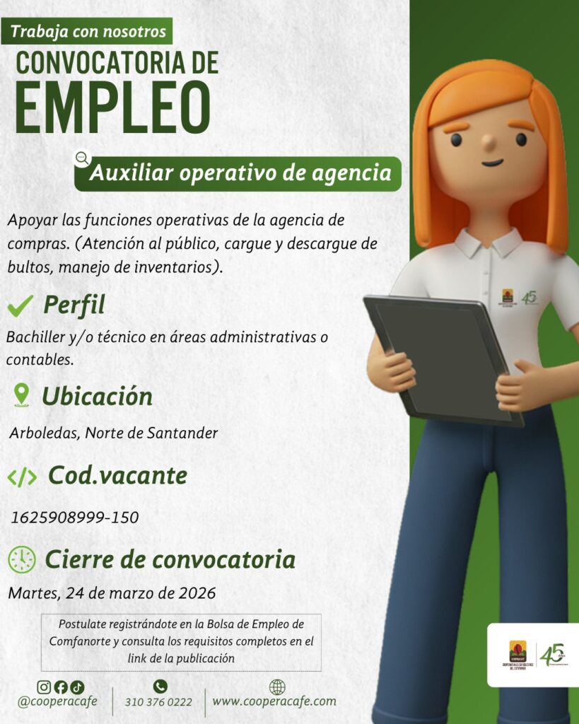 Asistente de Tesoreria¡Estamos buscando talento para nuestro equipo! En la Cooperativa de Caficultores del Catatumbo abrimos convocatoria para el cargo de Auxiliar operativo de agencia en el municipio de Arboledas.